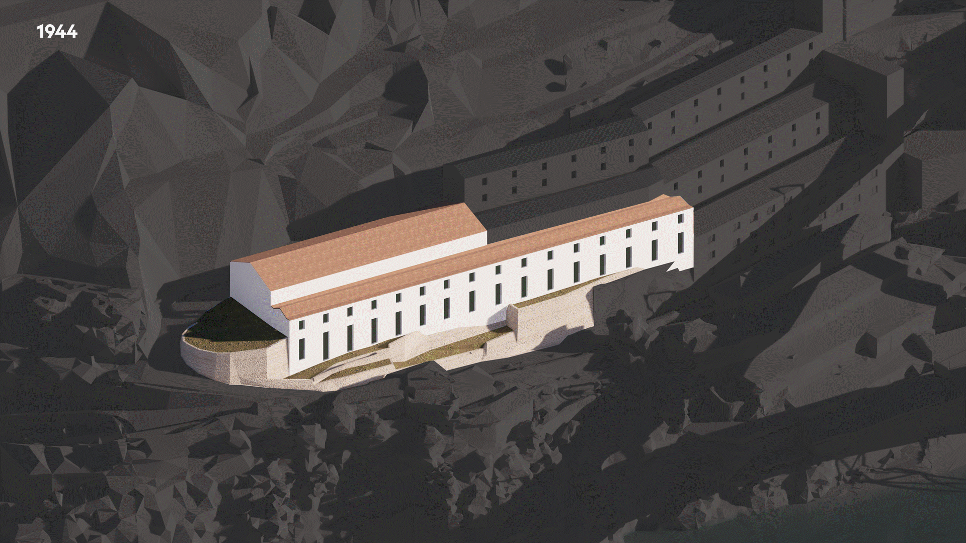 The building is carefully inserted into the existing ruins, maintaining alignment with neighboring structures and reinforcing a harmonious integration with the surrounding landscape. Programmatically, the house is organized into two distinct parts: the upper two floors accommodate the residential spaces, expressed through a lighter construction system and warmer material palette, while the lower levels are embedded into the rocky terrain and house the atelier, exhibition gallery, and garage.