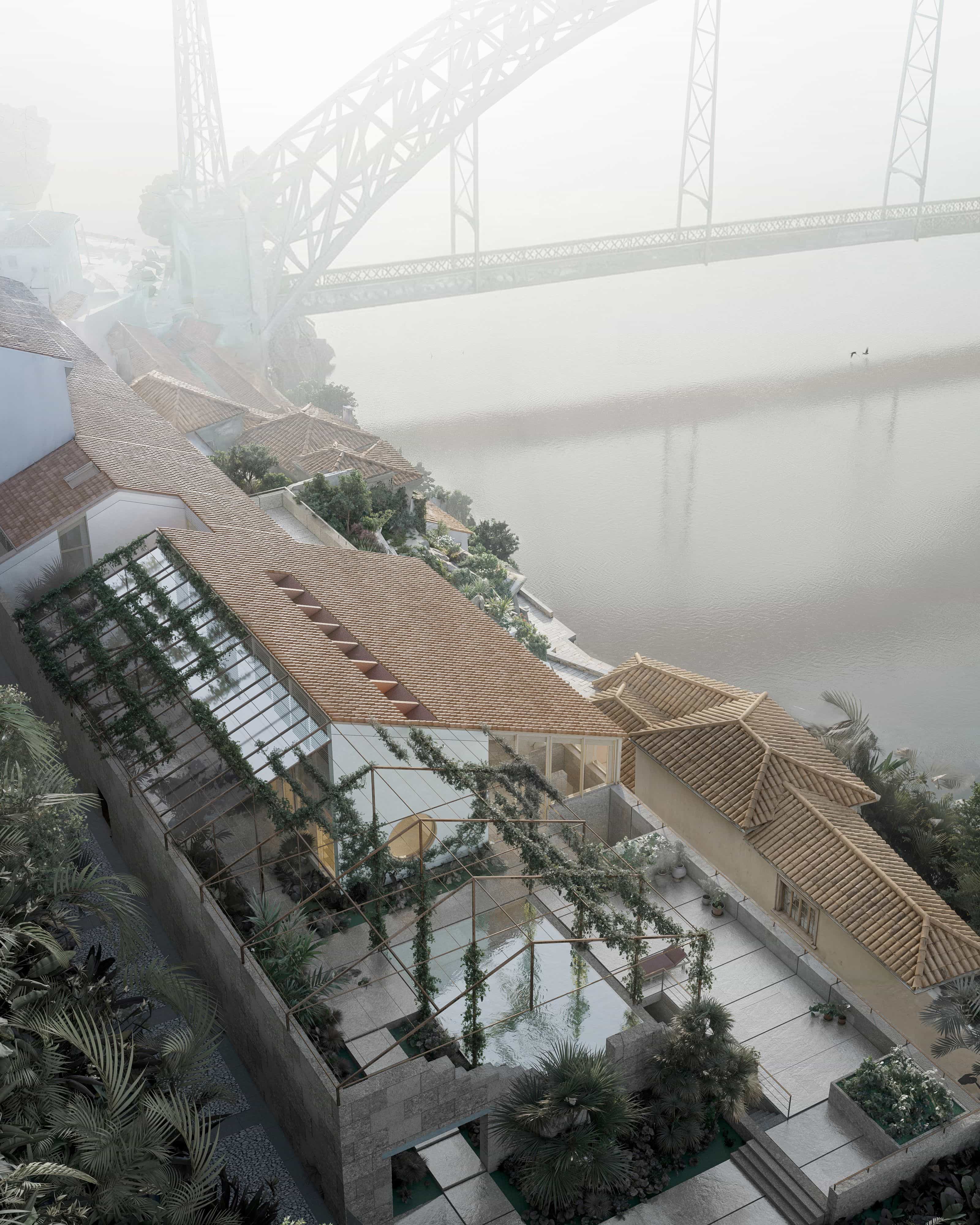 The project consists of a single–family residence that integrates an atelier and an exhibition gallery, located on a prominent site of significant cultural value. The plot is part of the city’s architectural heritage, marked by the remains of an old industrial complex now in ruins, as well as historic cellars that shape the area’s distinctive urban landscape. The site offers a powerful dual condition: on the one hand, a splendid view of the Douro River; on the other, extensive sun exposure, which together inform the project’s core design strategy.