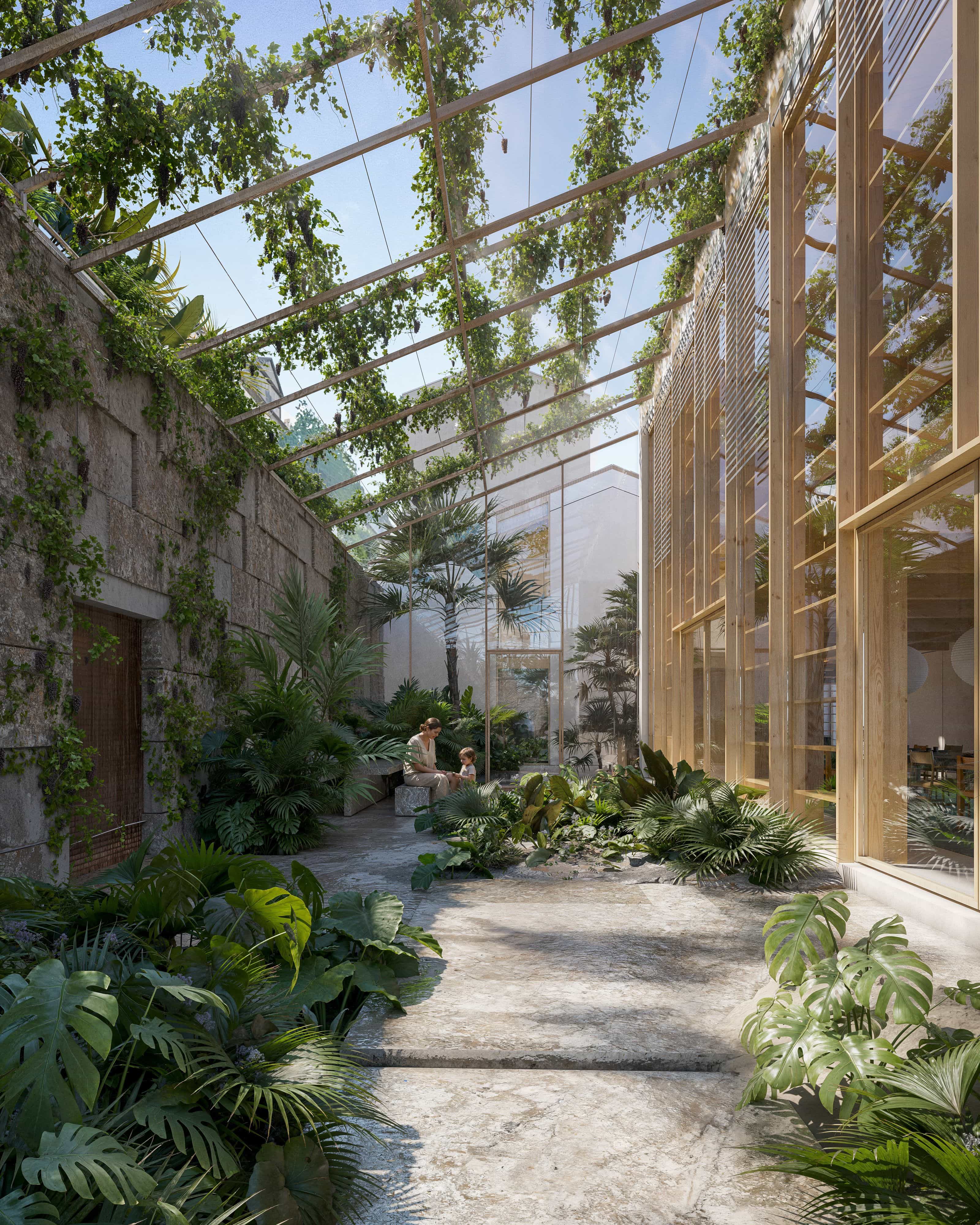 Responding to local climatic conditions, the new building volume is positioned slightly north of the existing main wall and its natural location, creating space for a winter garden that becomes the heart of the project. This greenhouse space enhances solar gains and acts as a thermal buffer, enabling passive heating during winter months and promoting natural ventilation when fully opened and shaded in warmer periods. As a result, the winter garden extends the usable living area throughout the year while contributing significantly to indoor thermal comfort.