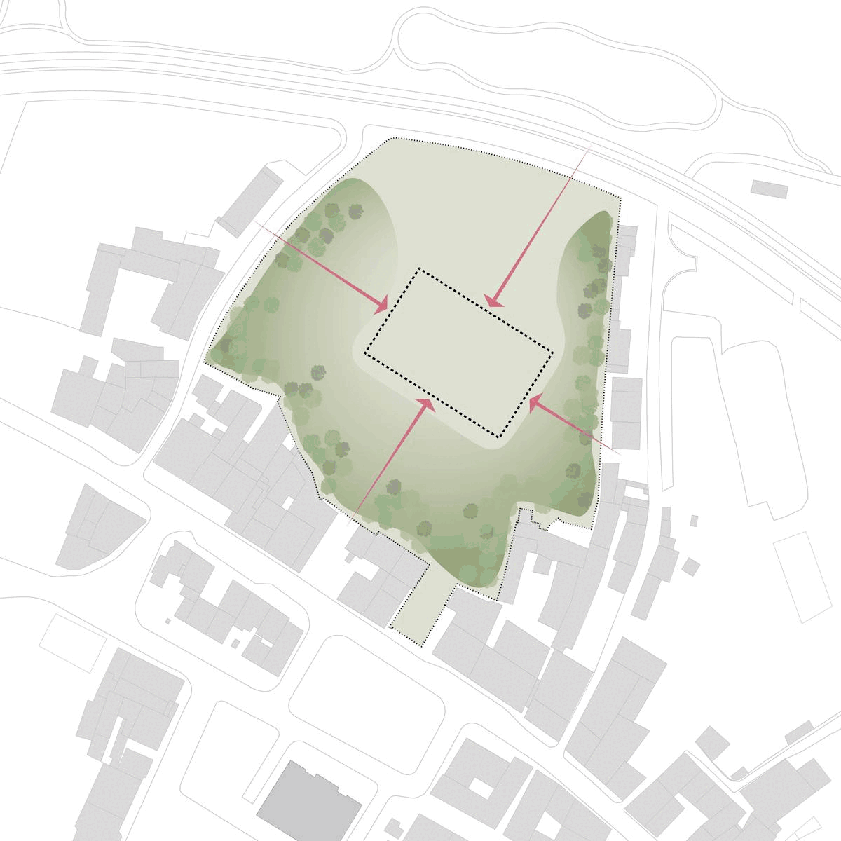 The methodological and conceptual process for developing the challenge presented in the competition promotes complementary dimensions of use, blending with the natural and urban space. The main objective is to make the object primarily invisible. The aim is to minimize the impact of construction in perfect symbiosis with nature while remaining committed to its intended use. The proposal also evokes the full potential of the roof, which transforms into a public space for collective use. The social factor becomes an anchor for the municipality and a fundamental condition for urban development.
