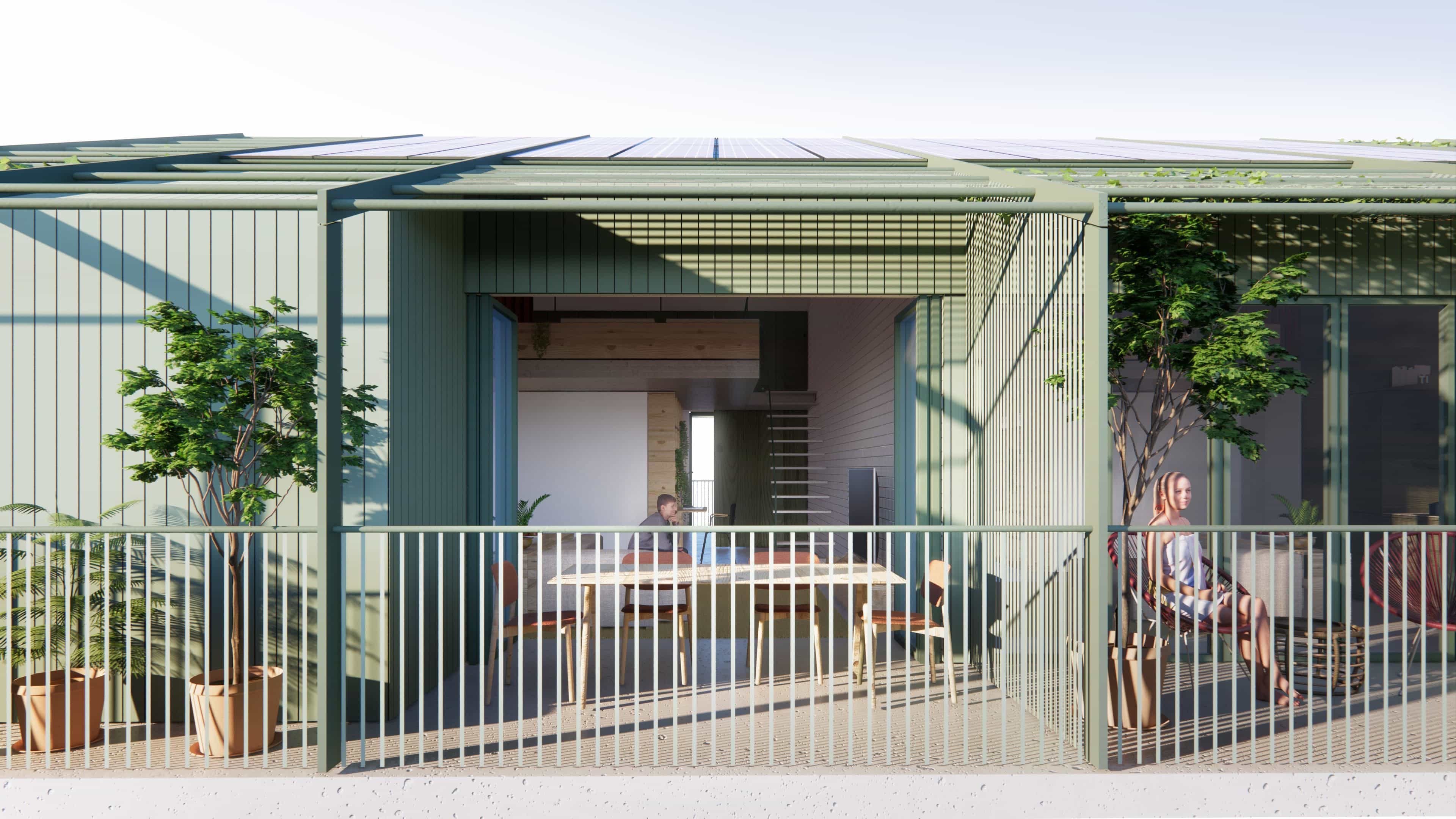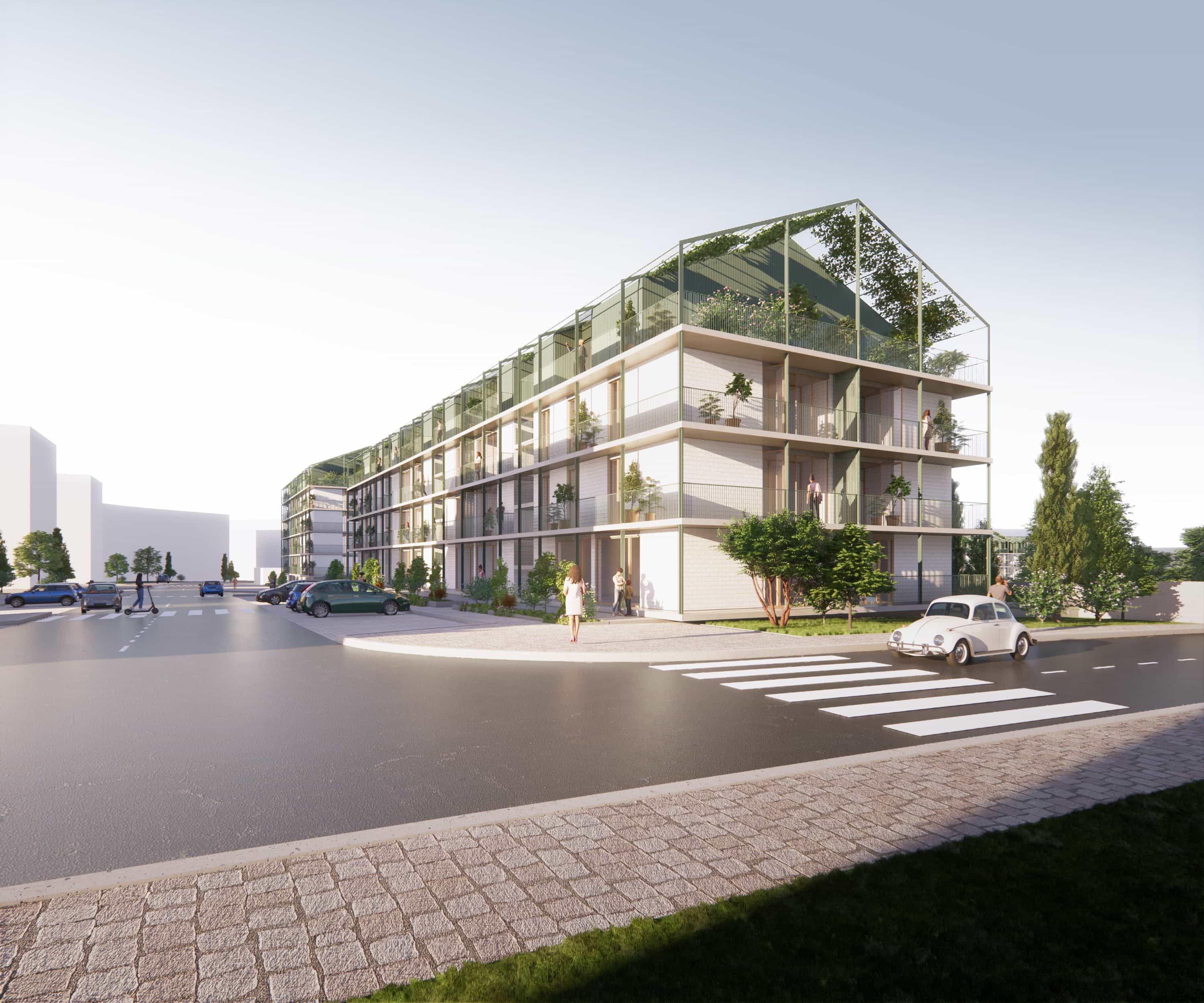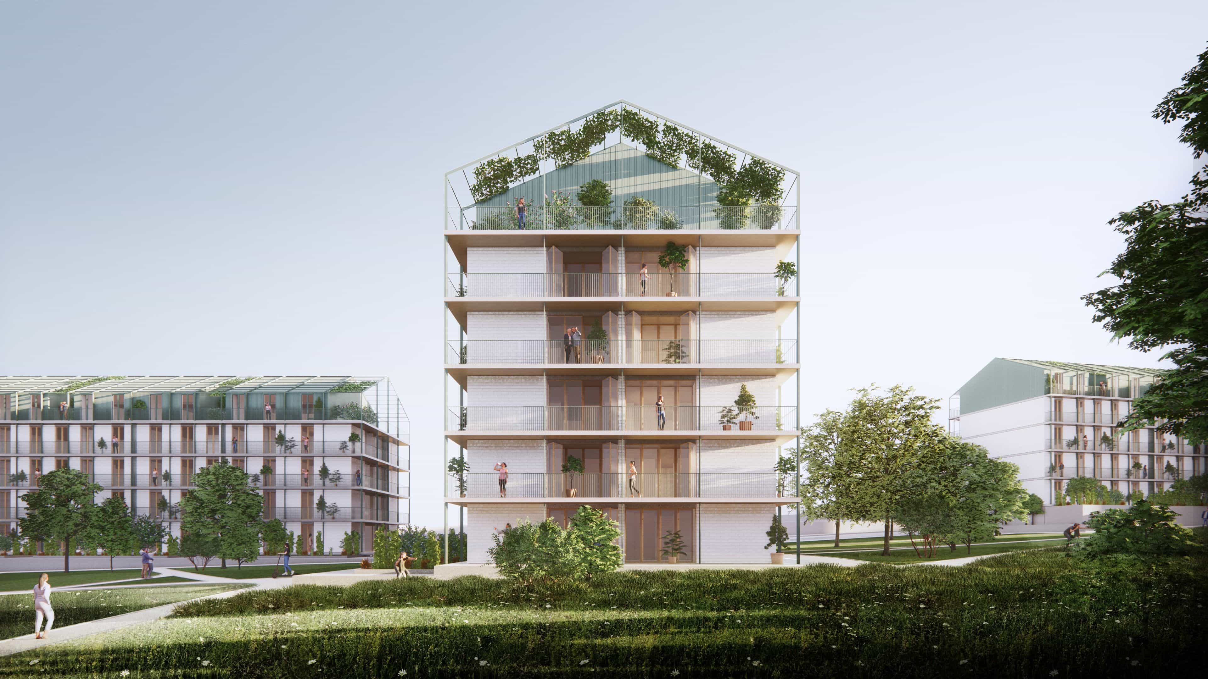 Additionally, the roof geometry results from the multiplication of the apartments below, with the addition of one mezzanine to turn a 2–bedroom apartment into a 3–bedroom unit. The project also incorporates passive design strategies, maximizing solar gains, providing ample daylight exposure, and natural cross ventilation. The apartments feature access to gracious balconies and winter gardens that function as thermal buffers, keeping the apartments warm in winter and blocking sun rays from the windows in summer.