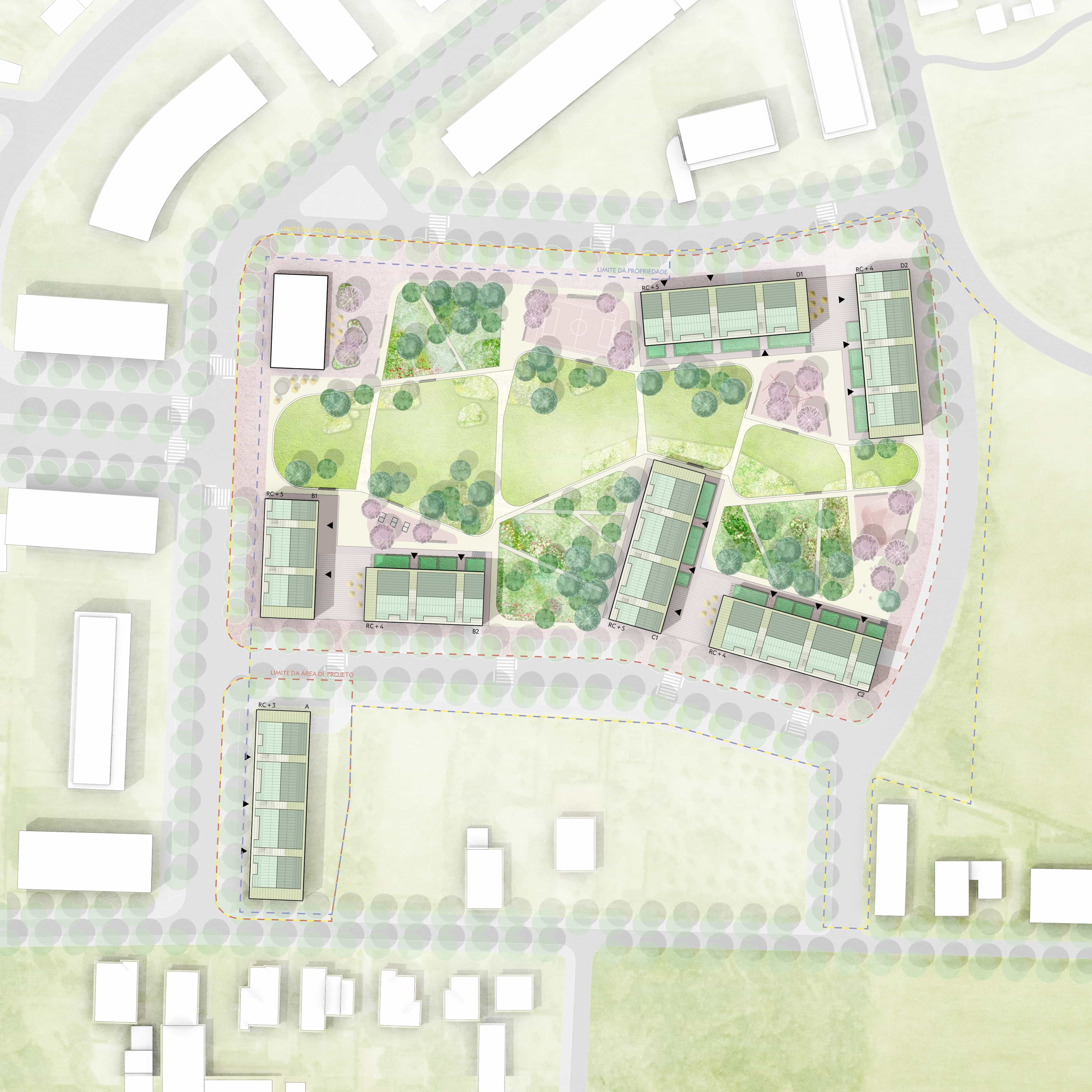 The Affordable Housing project in Maia, Portugal, is a 224–apartment unit complex located between a developed urban scenario and a more rural environment with 1 or 2 floors villas. The design strategy is focused on balancing these two different urban scenarios. The roof design takes inspiration from the countryside houses and offers more generous apartments with an outdoor garden on the last floor.