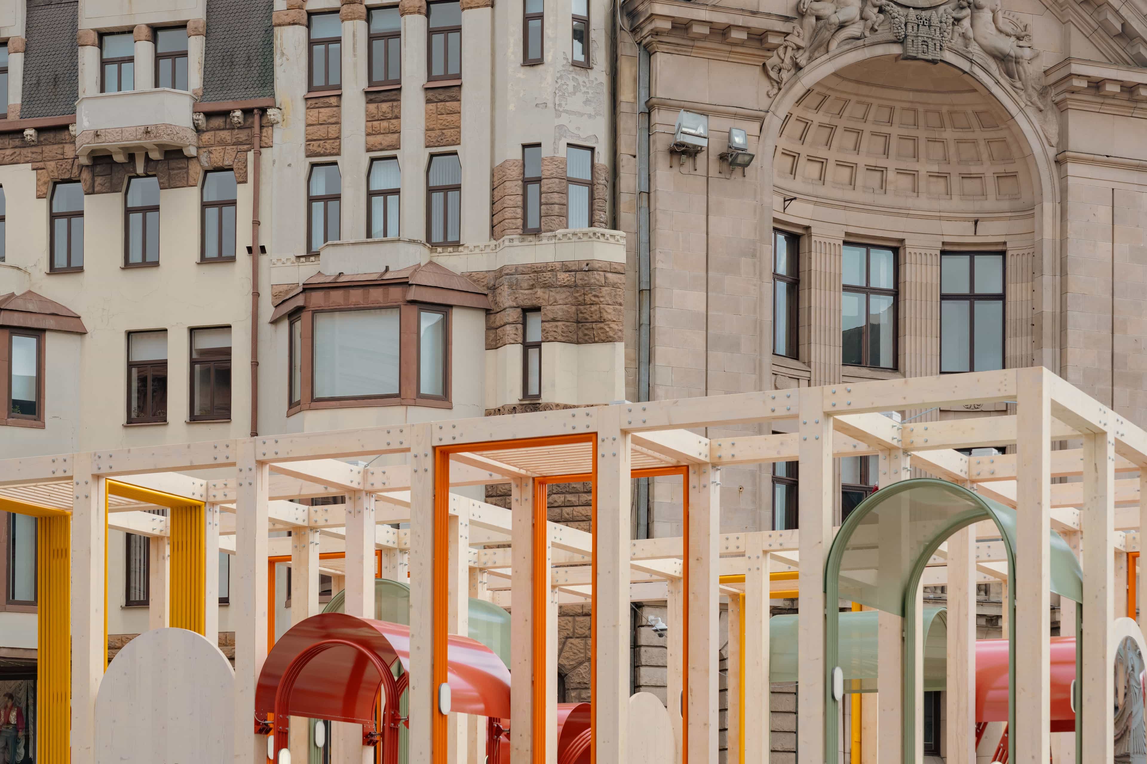 Dome Next Door is a summer urban art installation transforming Riga’s Cathedral Square into a vibrant hub of social interaction and cultural reflection. Running from July to September, the project addresses the square’s lack of a central gathering point by introducing a multisensory structure inspired by the city's historic architecture. The installation consists of four colourful modules—each designed for leisure, play, and community engagement—featuring swings, hammocks, seating areas, and rain shelters. Sustainability is central to the concept, using eco–friendly materials like timber Glulam's and steel, along with solar panels for energy self–sufficiency. Designed for disassembly and reuse, the structure can be relocated or upcycled after the event. Dome Next Door blends aesthetic appeal with environmental and social responsibility, creating a playful, inclusive, and dynamic public space rooted in Riga’s cultural heritage.