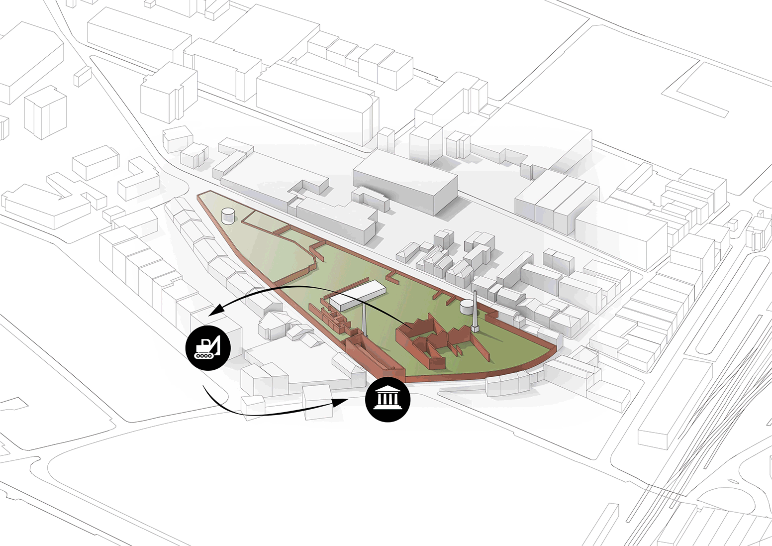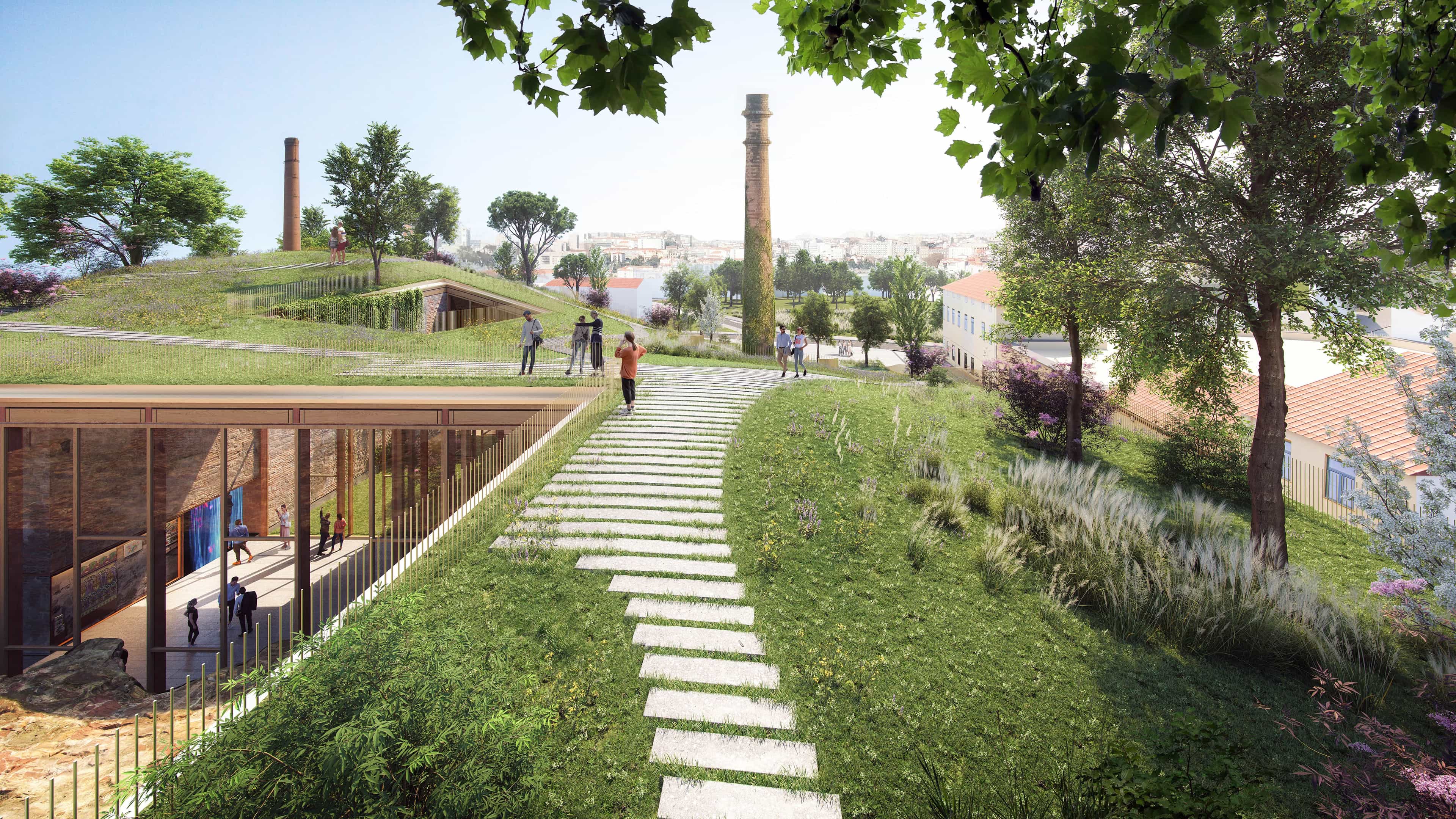 The proposal envisages a green veil being created over the entire plot, offering a qualified public space for the local community and the stage for the new museum. This space shares with the city all it's potential in its different uses and occupations. Throughout the park, one will find the reminiscences of the existing structures, monuments, and ruins of the old ceramic production halls. These can be contemplated from above: the old chimneys and furnaces become integrated within the park and museum. The roof becomes a topography and accessible for everyone. Museums require an admission fee, and only a few will visit its content. But not in this one: the museum is seen from inside out here.