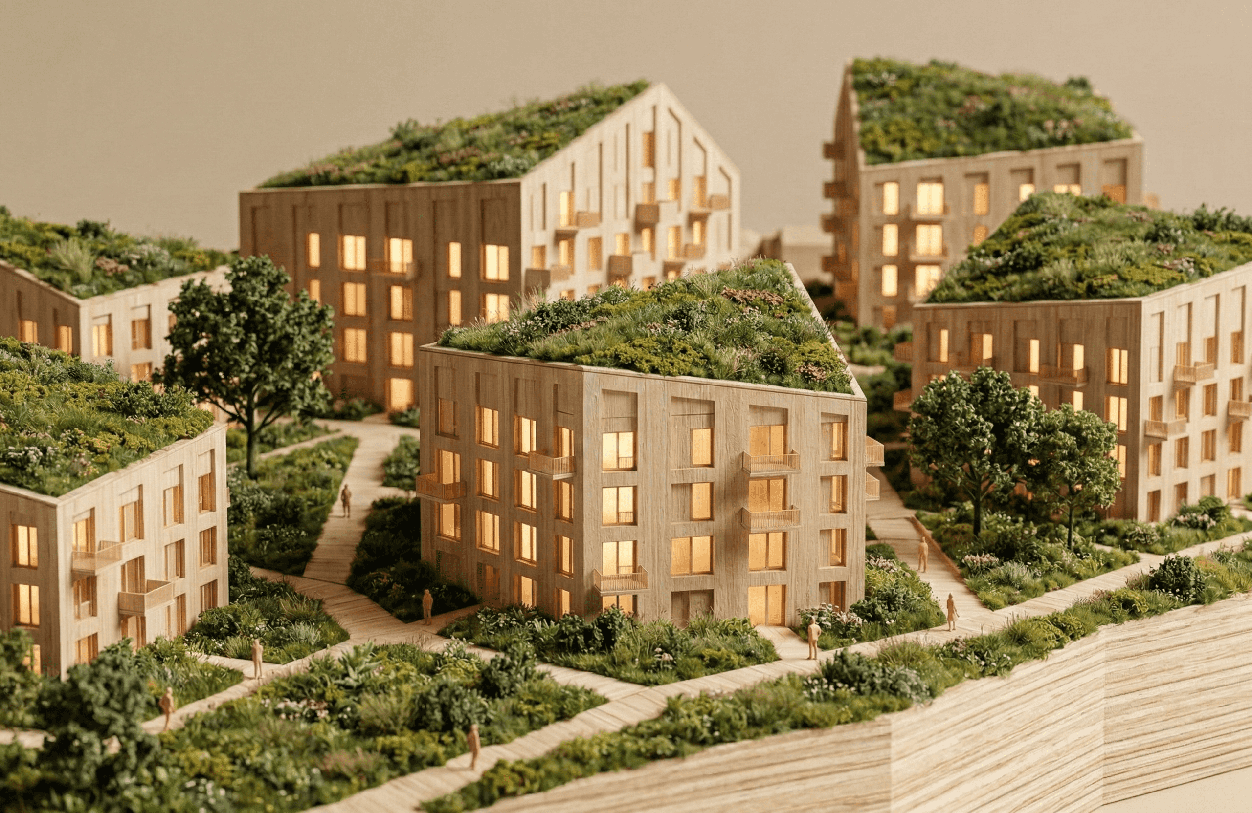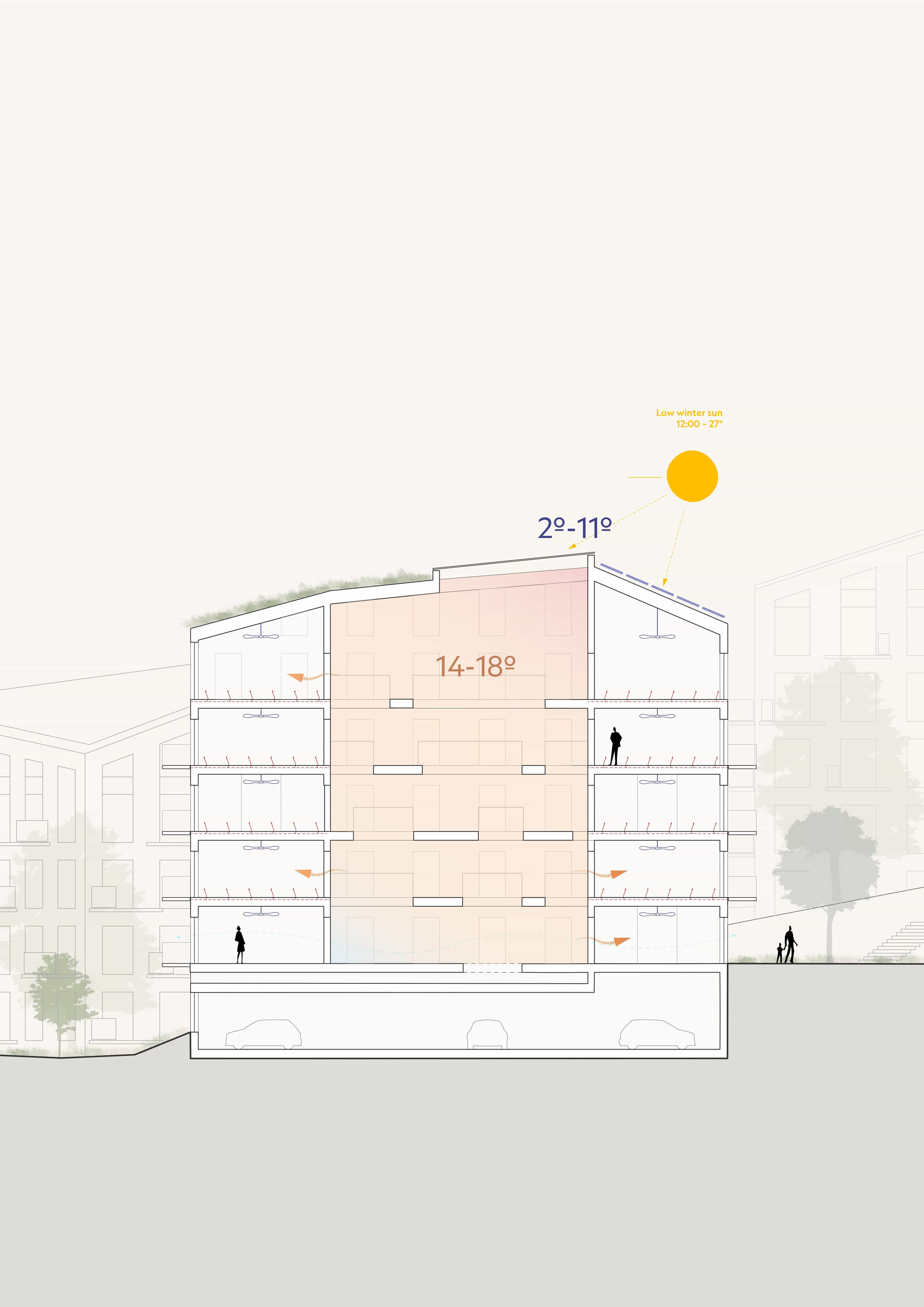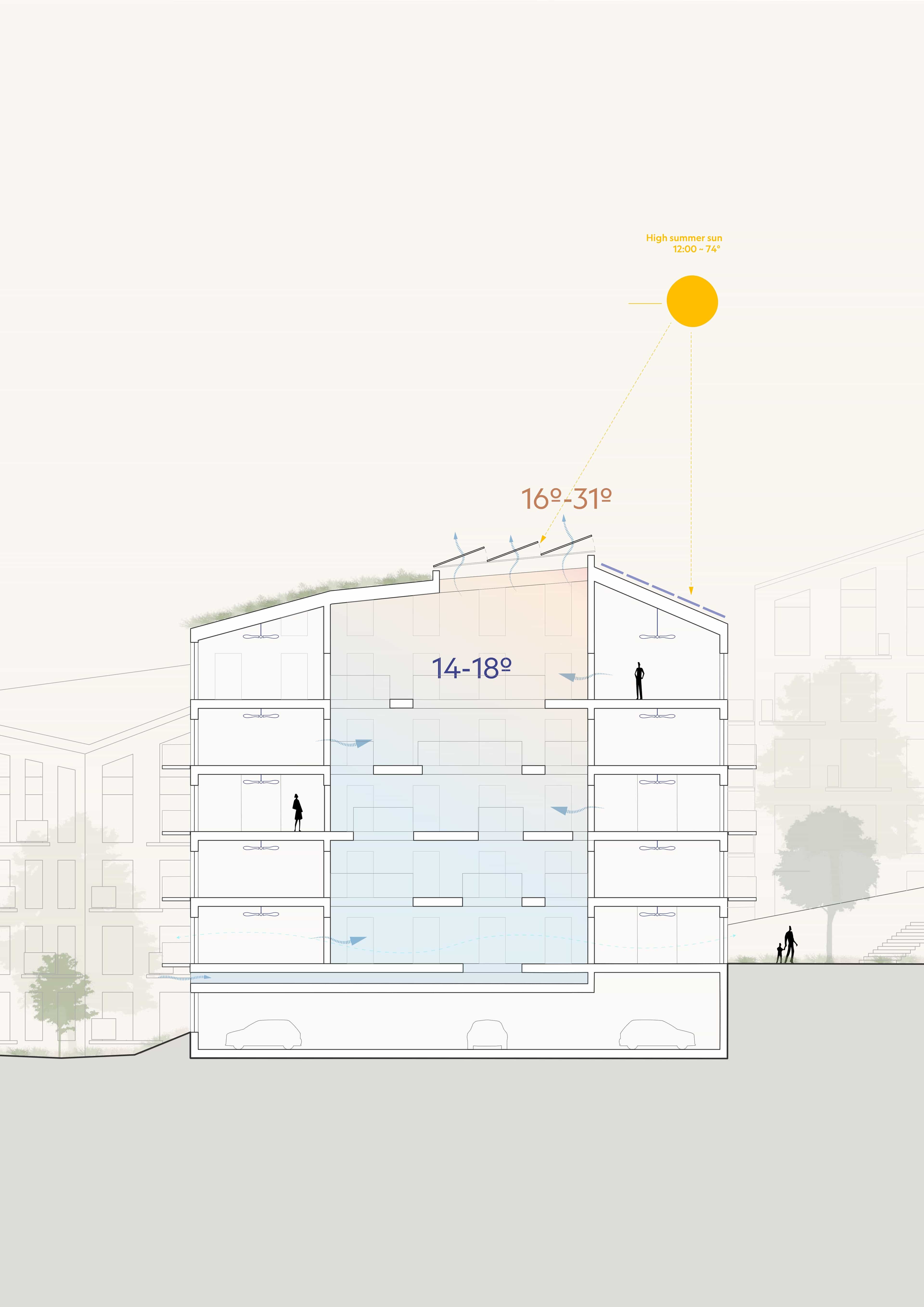 Internally, passive and bioclimatic principles guide the design. A central interior hall functions as a thermal buffer, moderating seasonal temperature contrasts and improving comfort while reducing energy demand. Together, these strategies create a contemporary residential development that aligns urban growth with environmental sensitivity and long–term regeneration.