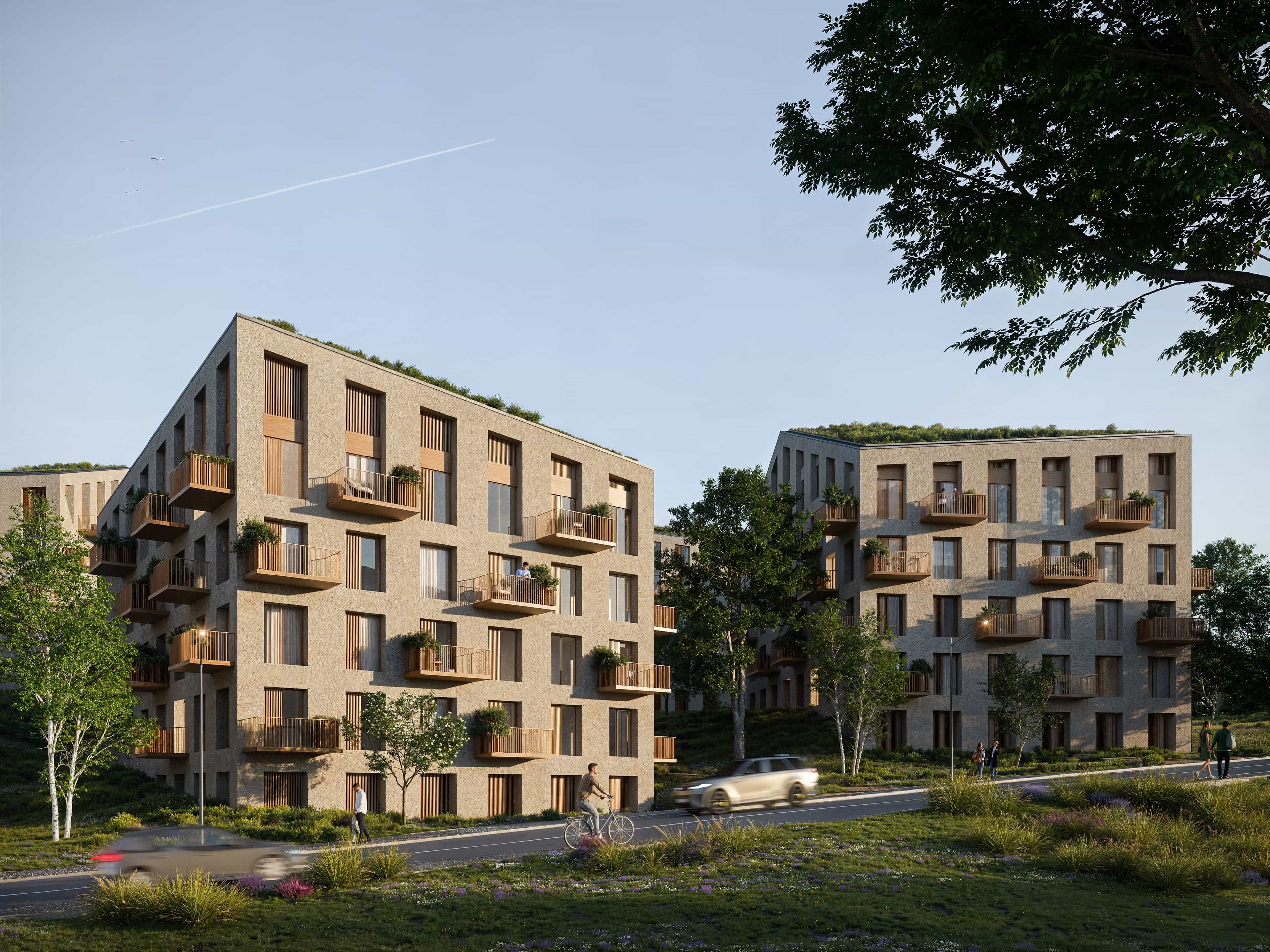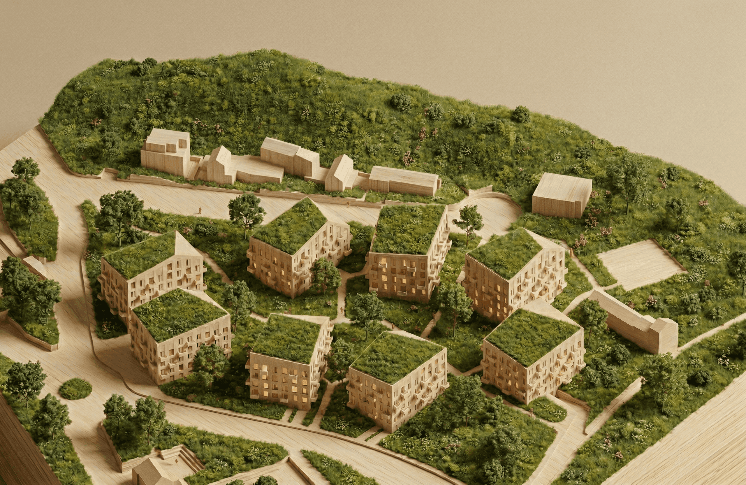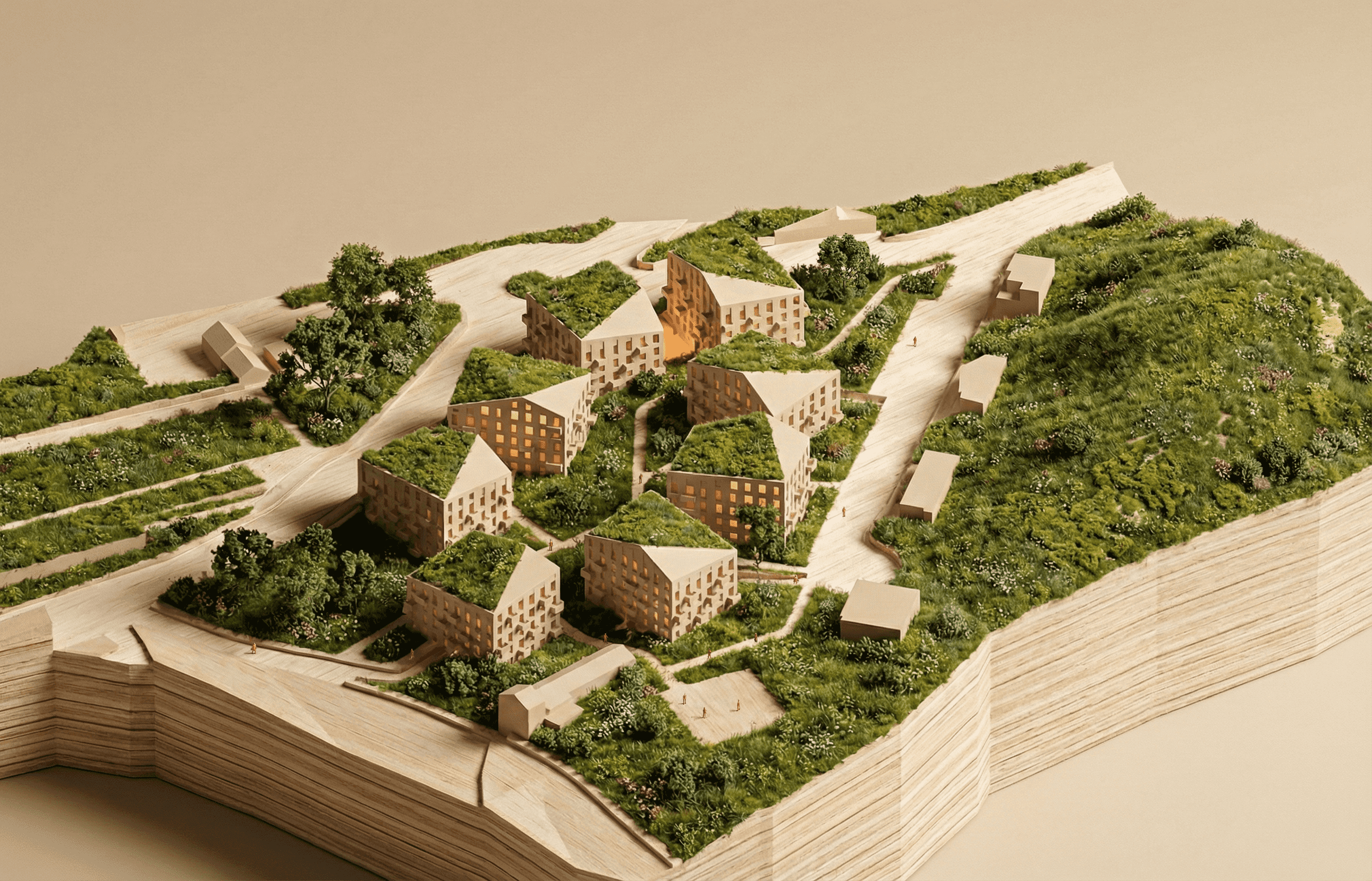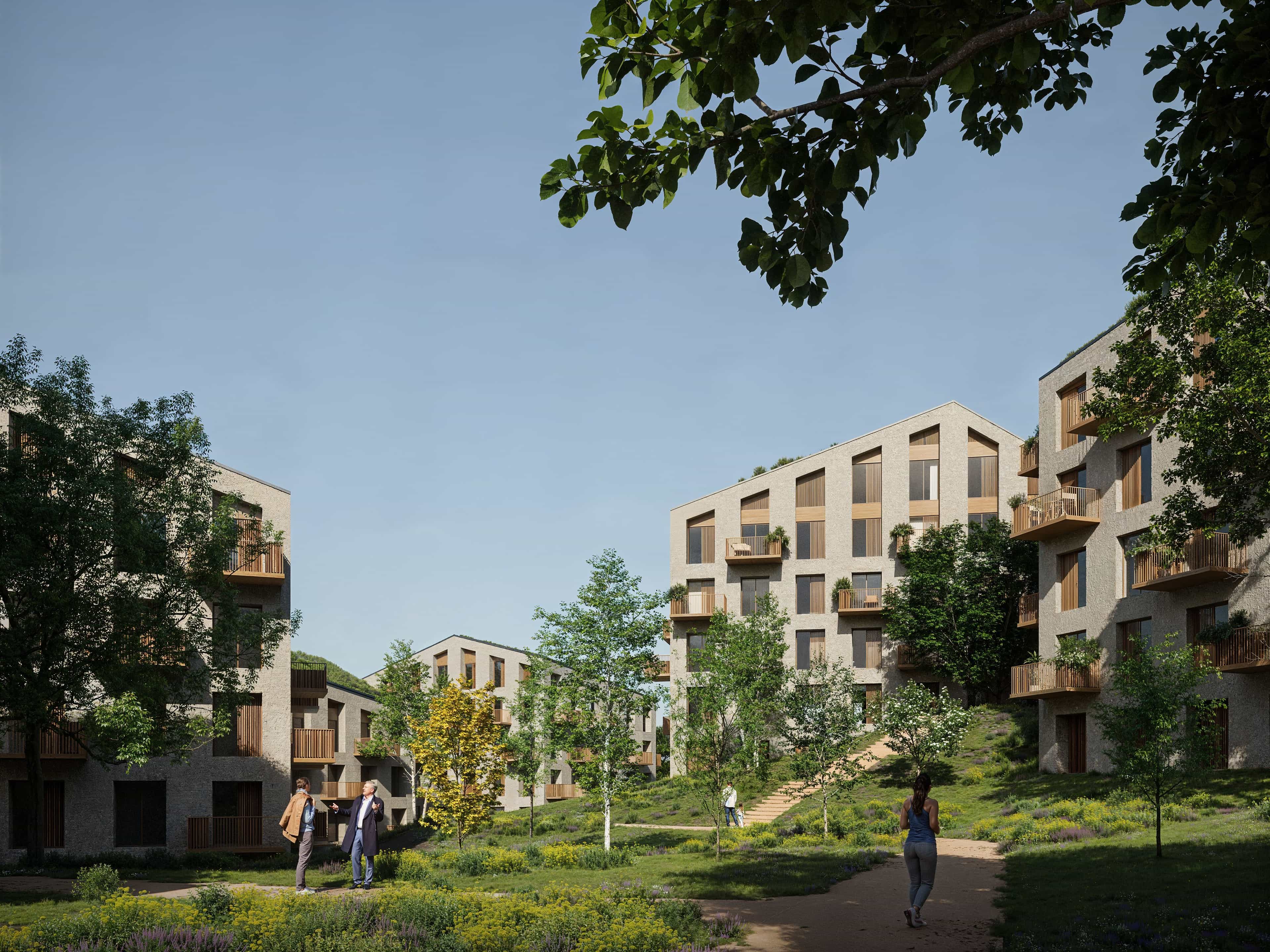 Public space plays a central role in the masterplan. Designed as an accessible and inclusive setting, it promotes social interaction while supporting local biodiversity through green areas, pedestrian connections and landscape continuity. The urban design encourages movement across different levels of the terrain, creating a coherent and human–scale public realm that integrates naturally with the wider city.