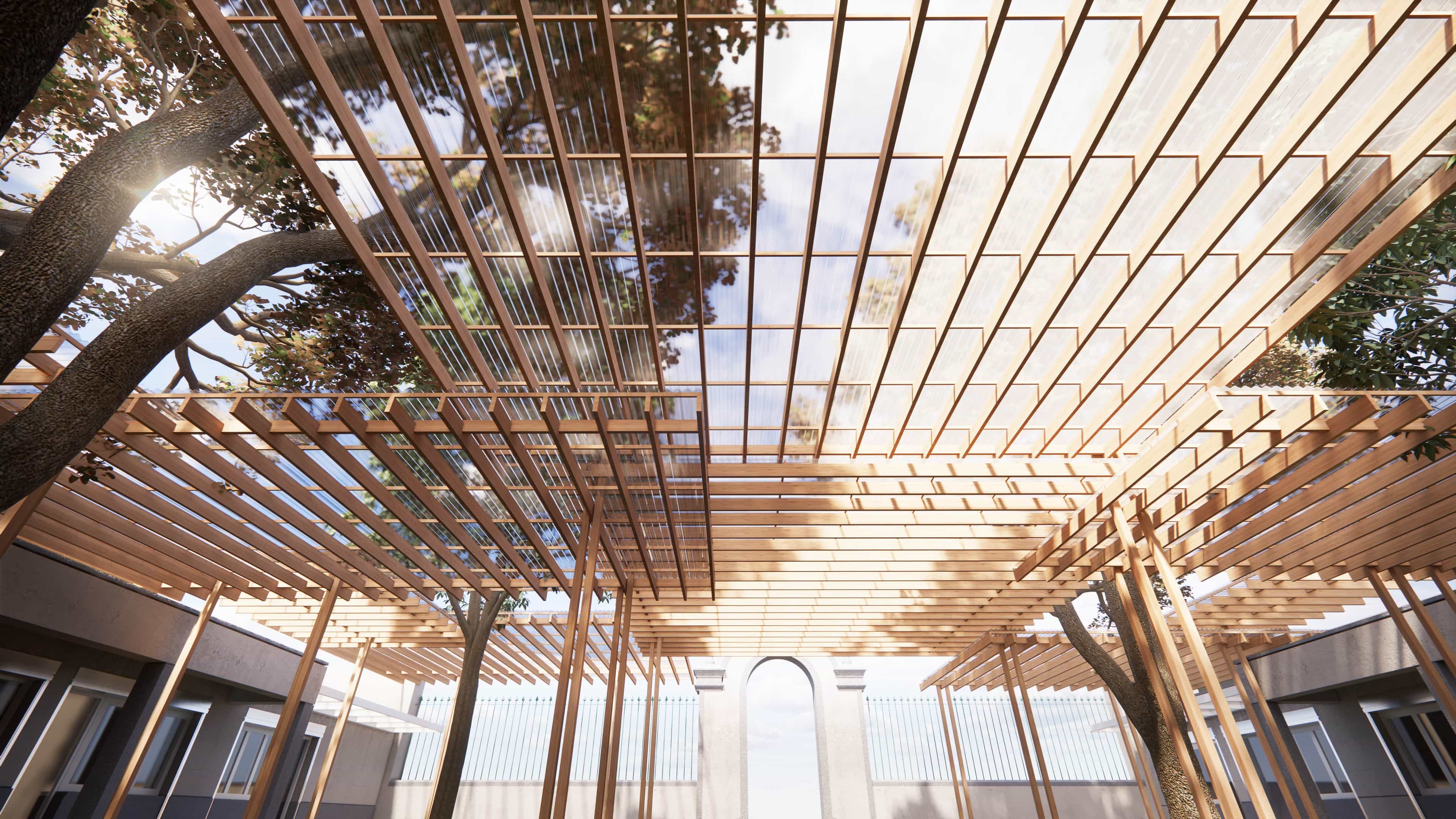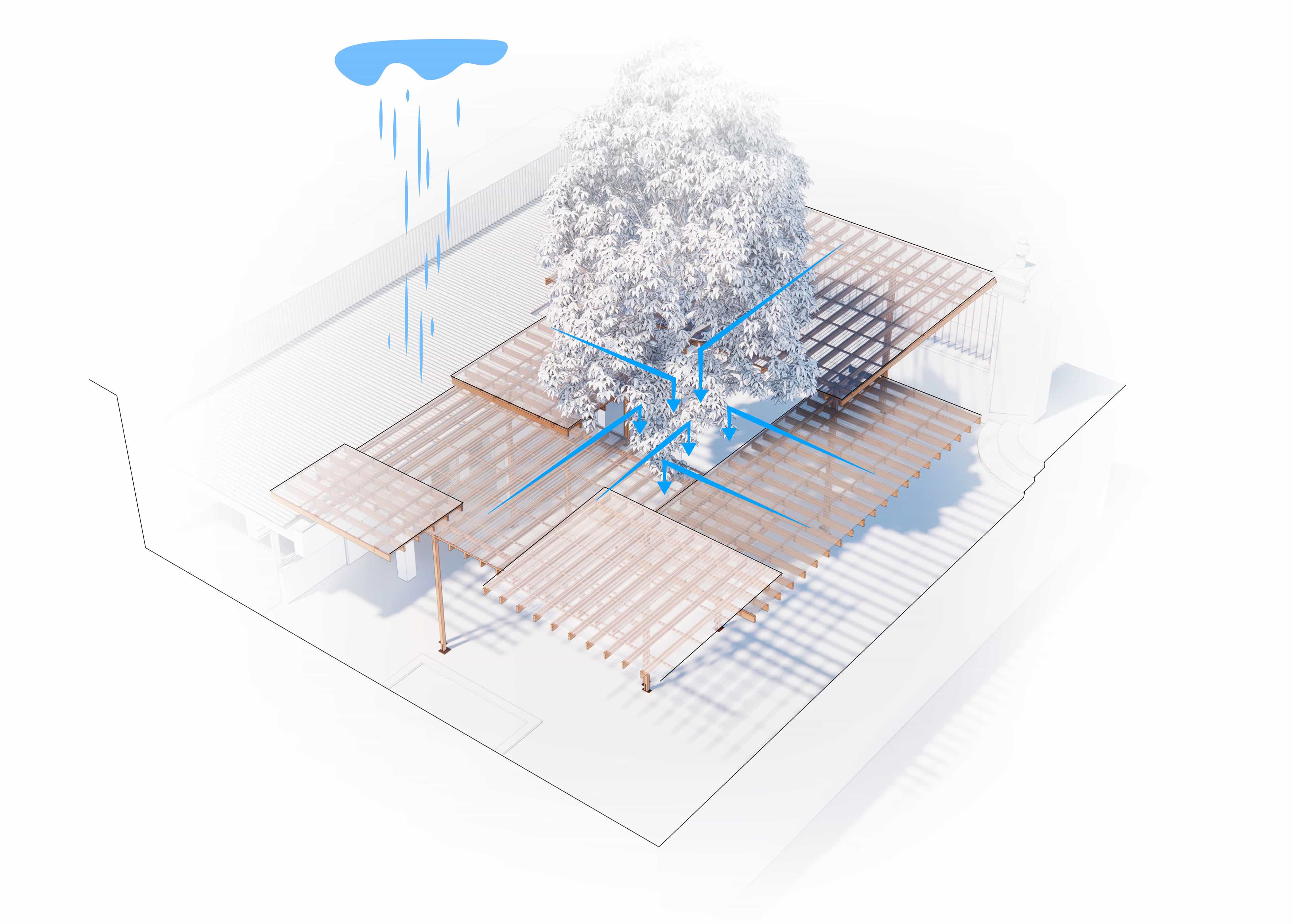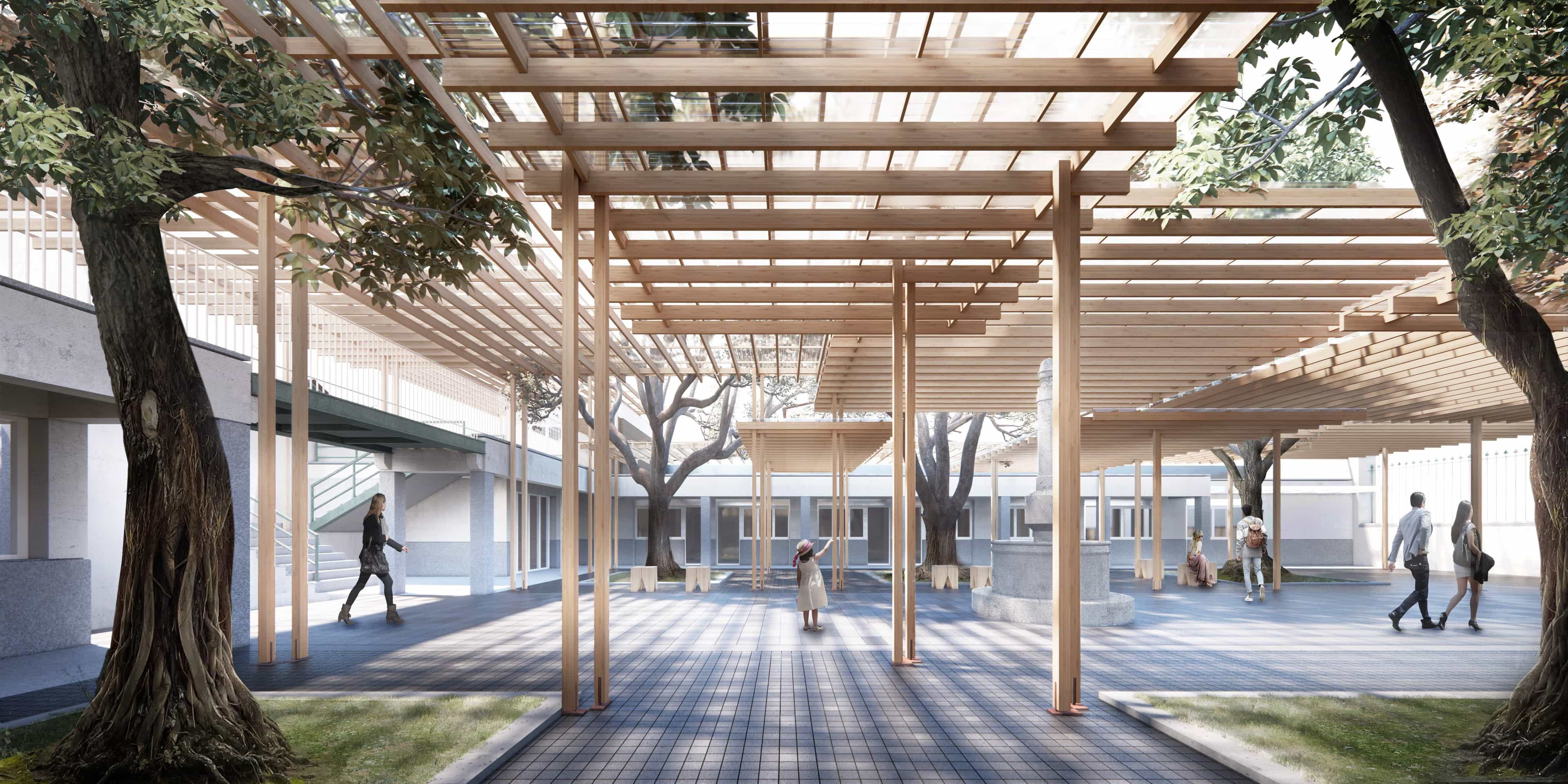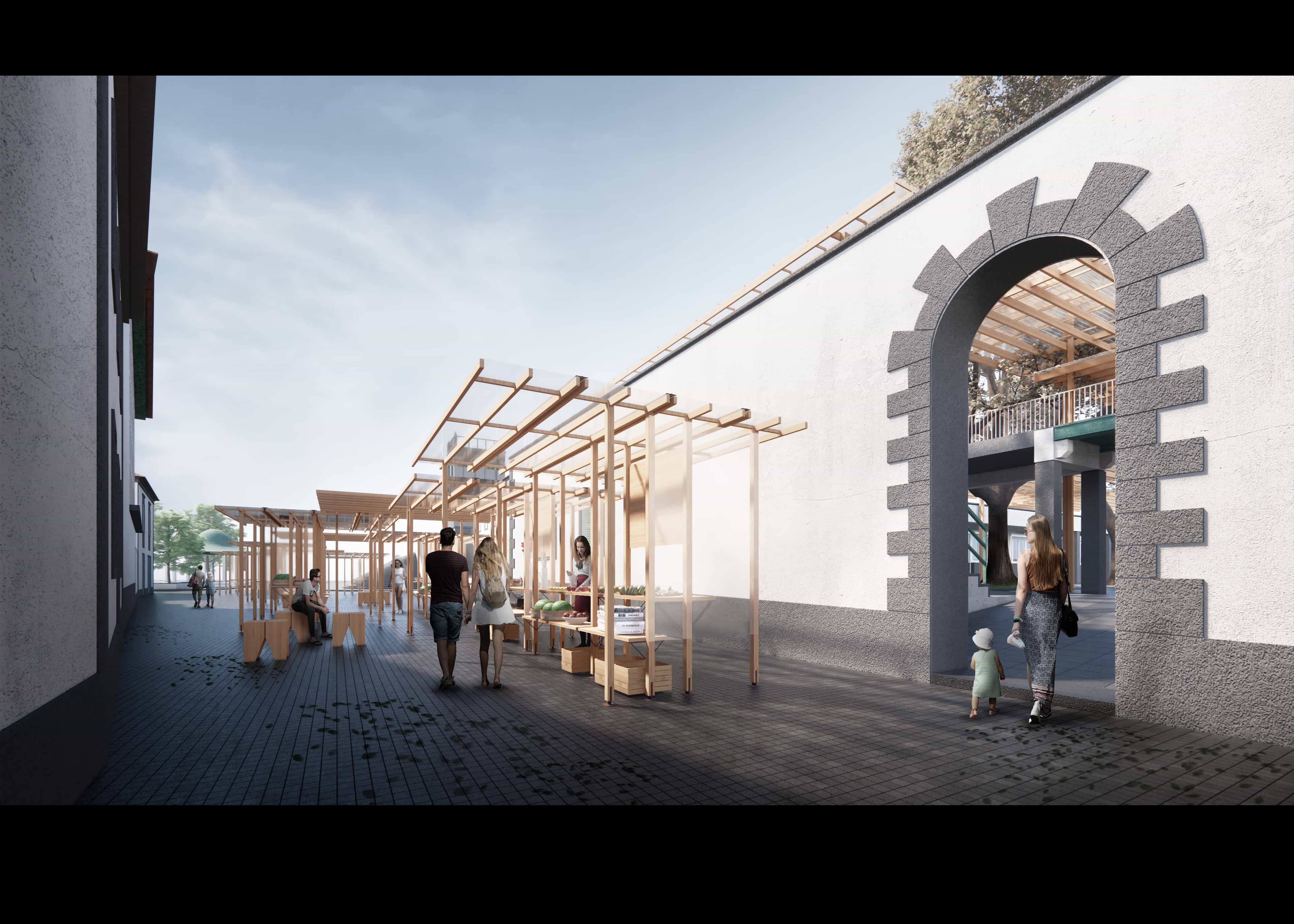 This study foresees the development of a structure that communicates with the current image of the market and its natural elements, without changing its essence. The proposal is based on a modular system of panels, composed of linear timber profiles and a recycled polycarbonate skin, allowing daylight to enter and still perceive the existence of the canopy of large trees.