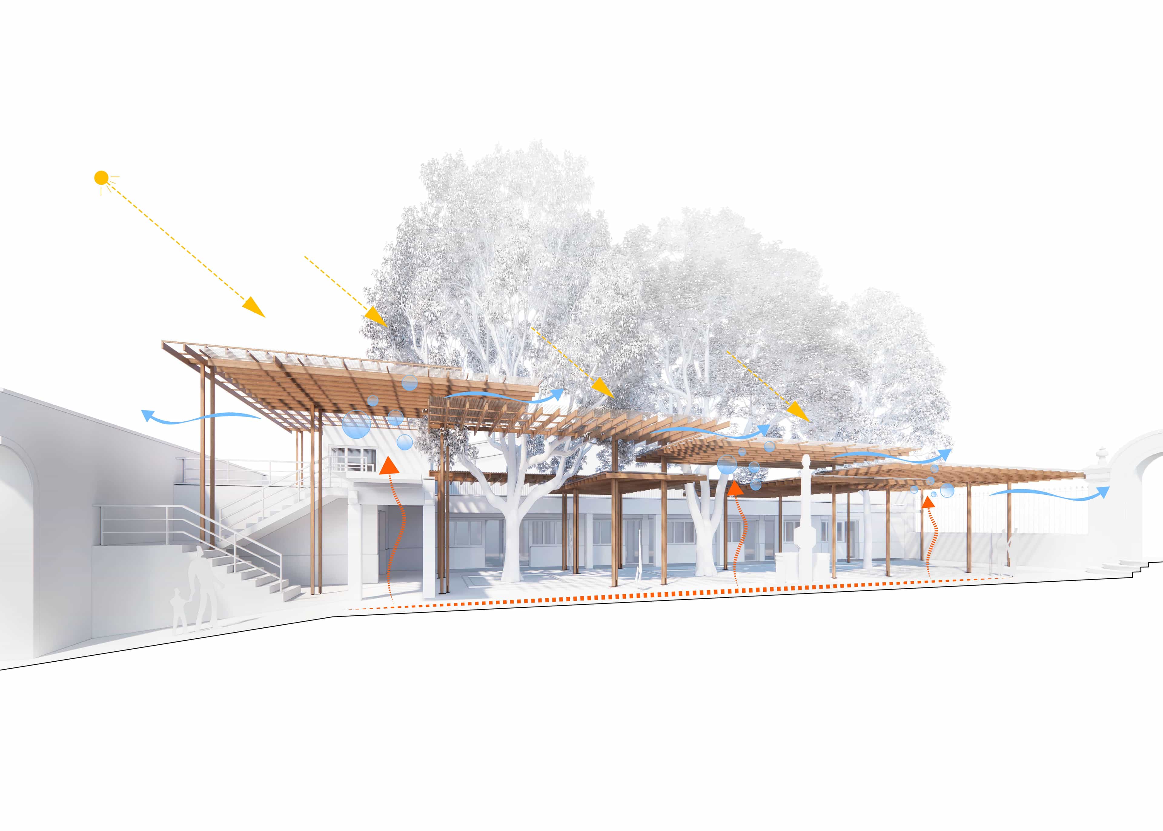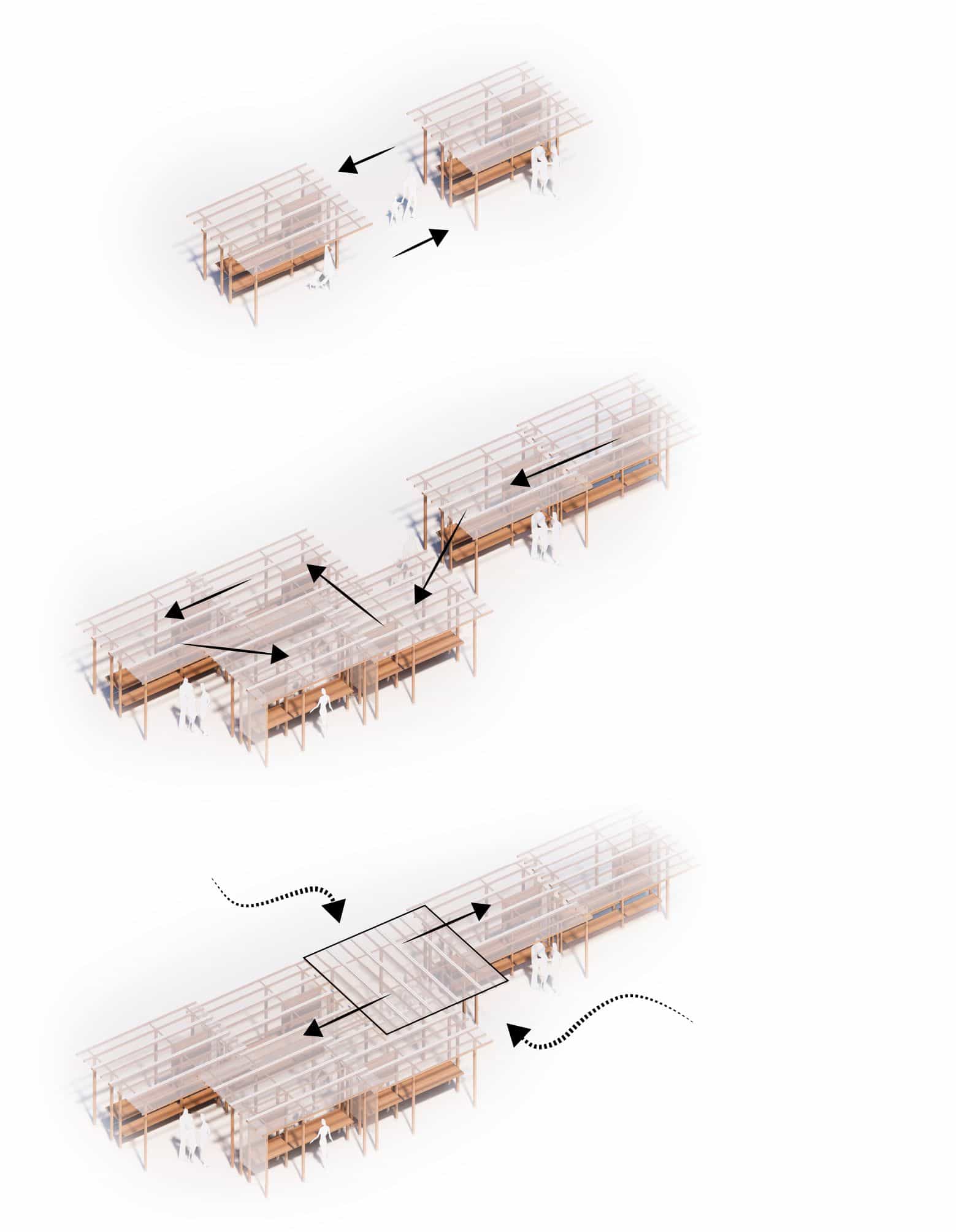 The overlapping of the different horizontal planes, each with different heights, lets the air penetrate and circulate inside the market, as it facilitates easy connections between each element.